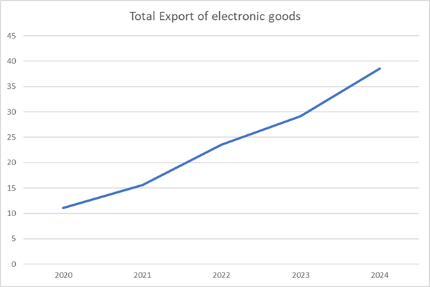 In India, the electronics industry is turning out to be one of the fastest-growing industries. It is estimated that India’s exports will triple to USD $835 billion by 2030, from US$431 billion in 2023, at a compound annual growth (CAGR) rate of 24 percent. Exports of electronics are anticipated to rise from US$28 billion in 2023 to US$61 billion in 2030.
